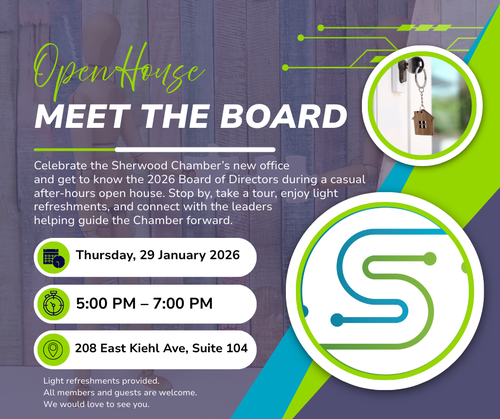 Come celebrate the Sherwood Chamber’s new office and get to know the 2026 Board of Directors during a casual after-hours open house. Stop by, take a tour, enjoy light refreshments, and connect with the leaders helping guide the Chamber forward